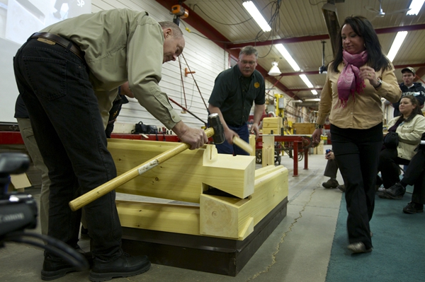 记者来到赖特曼的工厂参观时,看到厂区垛着很多木材。这些木材都是正在自然风干状态,加拿大北部的原始森林有很多几百年的原木,木材刚砍下来的时候非常潮,对其定性切割的时候一定要选择在冬季,因为树浆在寒冷的冬季流动性小含量也低一些。为了使树浆能自然蒸发,需要把条木在室外垛好自然风干,条木要呈东西向摆放,各条木之间还要垫放木条,以方便空气流通。木料在被深加工之前,需要在户外风干几年的时间,看着真让人着急,一旦有了大批订单,真担心他们这样按部就班会误事。也正是由于加拿大人这种不急不躁的性格,使得他们已经从家族企业变成国际性企业,目前世界各地都有他们的客户,可惜中国还是空白。