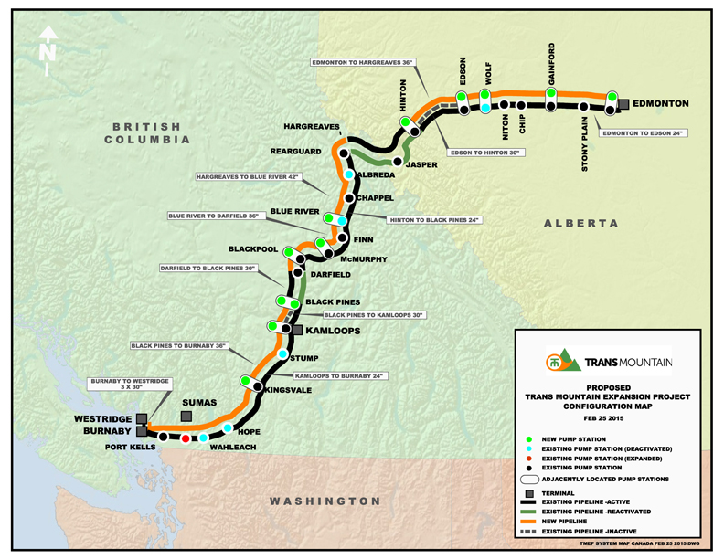 如上图所示,原油和燃料油从阿尔伯塔大温,经北素里、高贵林西进入本拿比,随后,输油管道分成了两个方向,红线为燃料油,向西南方向穿过本拿比进入列治文北区,通往温哥华国际机场;连接现有的本拿比北区几个炼油厂,黑线为原油,进入SFU大学的储油罐和Burrard
