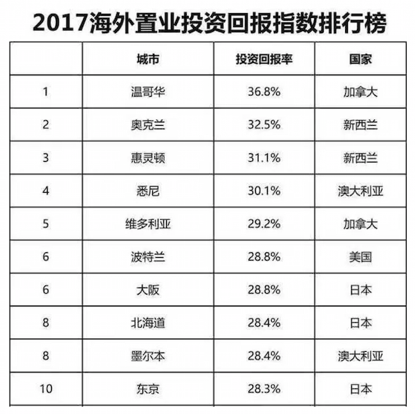 新西兰的奥克兰、惠灵顿分别排在第二、三位。加拿大BC省的维多利亚排名第5位,投资回报率为29.2%。