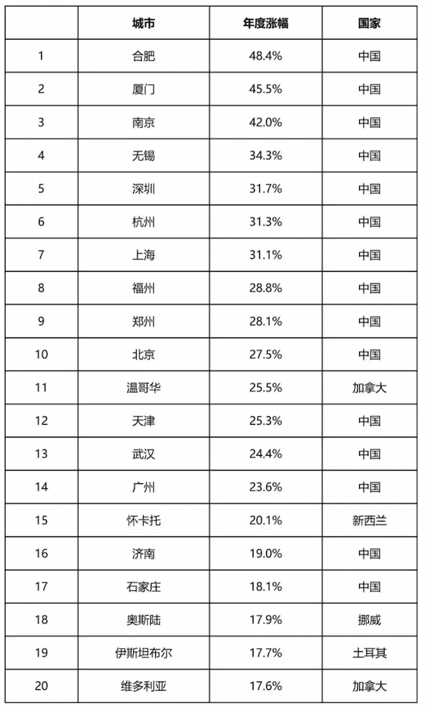 合肥、厦门、南京排名前三,涨幅均超过40%,上海排第7名,涨幅为31.1%。紧接着第11名就是加拿大的温哥华啦!涨幅为25.5%。