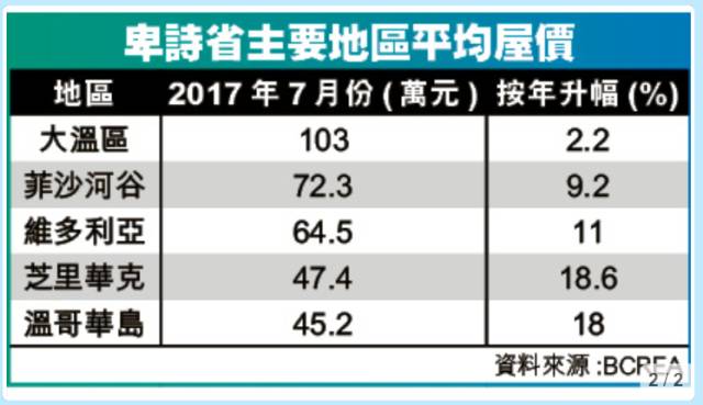屋价方面,今年7月份,卑诗省平均屋价为69.9万元,较去年同期的上升5.3%,其中大温平均屋价由去年7月的100.8万元,增加至今年7月的103万元,微升2.2%。