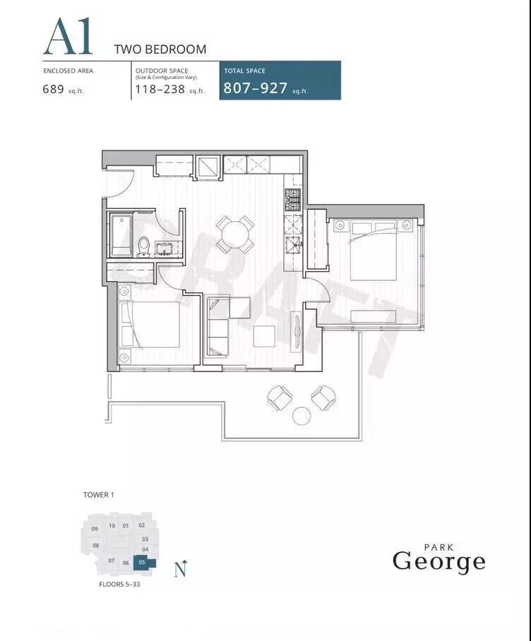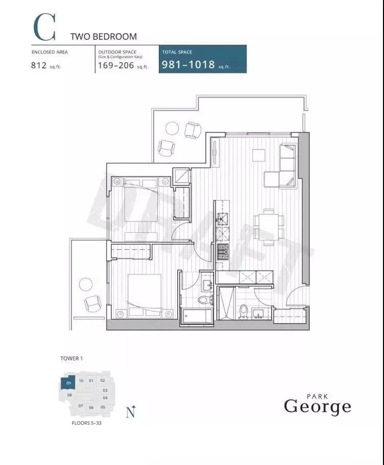 户型图(Tower 1):4-33层 (点击下图查看更多信息)