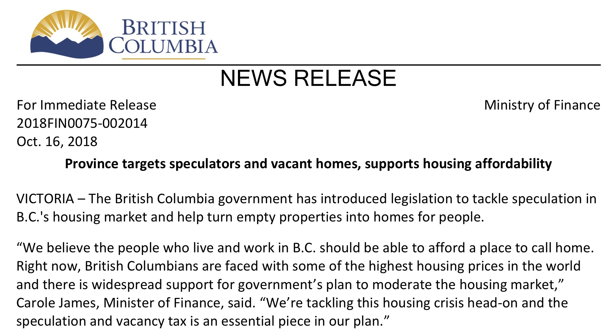 BC省政府周二宣布,已经提交法案,确定开始征收投机税,以此来解决房地产投机的问题。尽管BC省的多位市长,多数居民极力反对,BC省仍然在今天10月16日,对房屋投机税正式立法,开始征收。