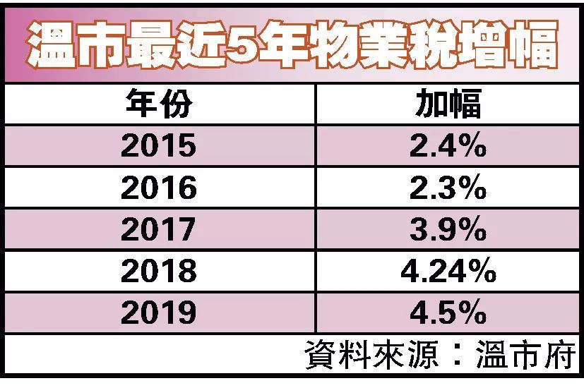 在12月11日的温市议会特别会议上,24位市民对预算发表意见,当日市议会未作决定,至周二由市议会讨论预算,并对市府职员、温市警、消防局等部门负责人做询问。周二虽未安排市民发言,但十多位市民携带标语,在市议会二楼举牌抗议增加物业税。如物业税加4.9%,以单户家庭房屋的中位价180万计算,物业税要多付108元,不过,市府职员在周二晚上,暂时未计算出加4.5%后的物业税款实际增加多少。
