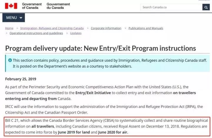C21法案,加拿大边境管理局(CBSA)即将实行收集出入境旅客的管理资料及信息。2019年6月起对陆路进出的跨境者生效,2020年6月起对航空出入境者生效。
