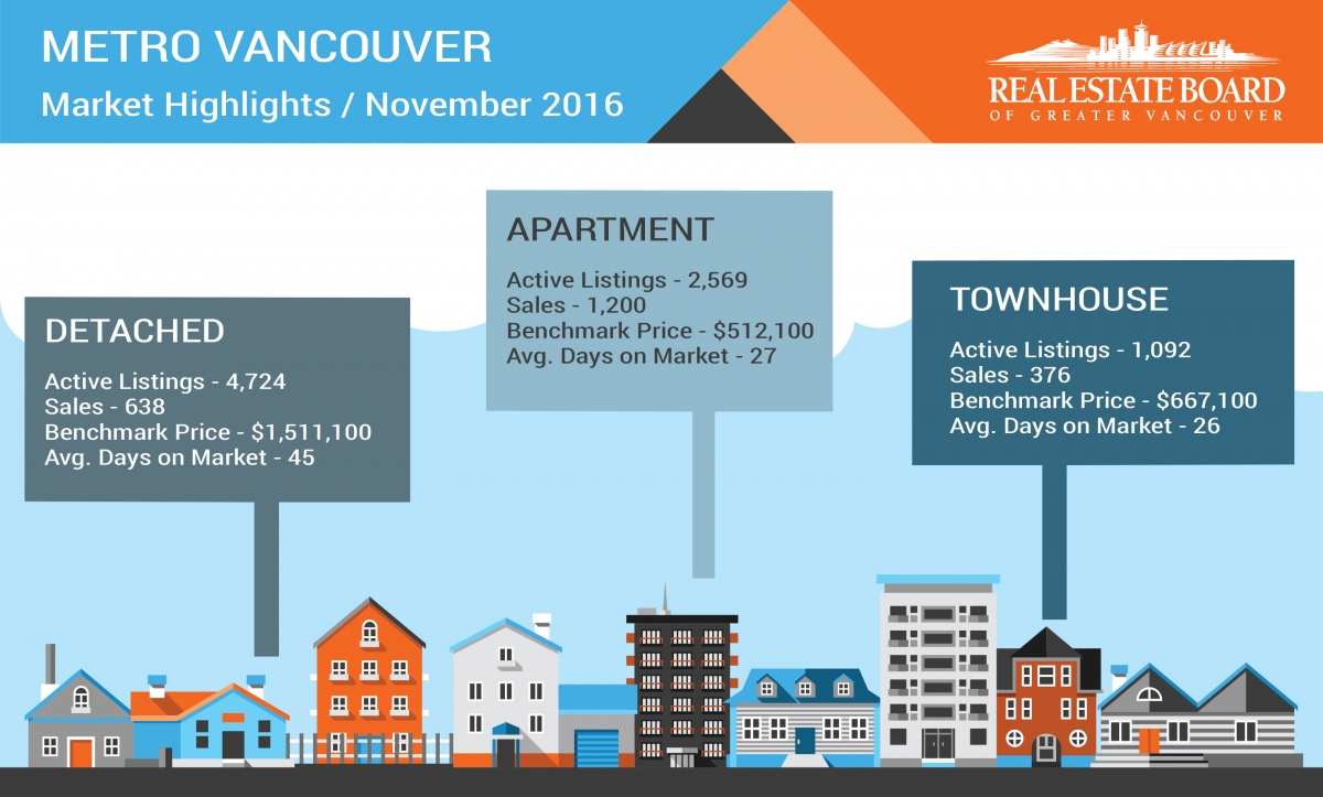 根据大温房地产局(Real Estate Board of Greater Vancouver)昨天发布的数据,大温地区住宅市场的卖家和买家活动仍然维持在历史平均水平附近。2016年11月,住宅市场销售量为2,214套,较10月份的2,233套减少9%,与去年同期的3,524套相比减少了37.2%。11月份的销售量较十年平均水平低7.6%。
