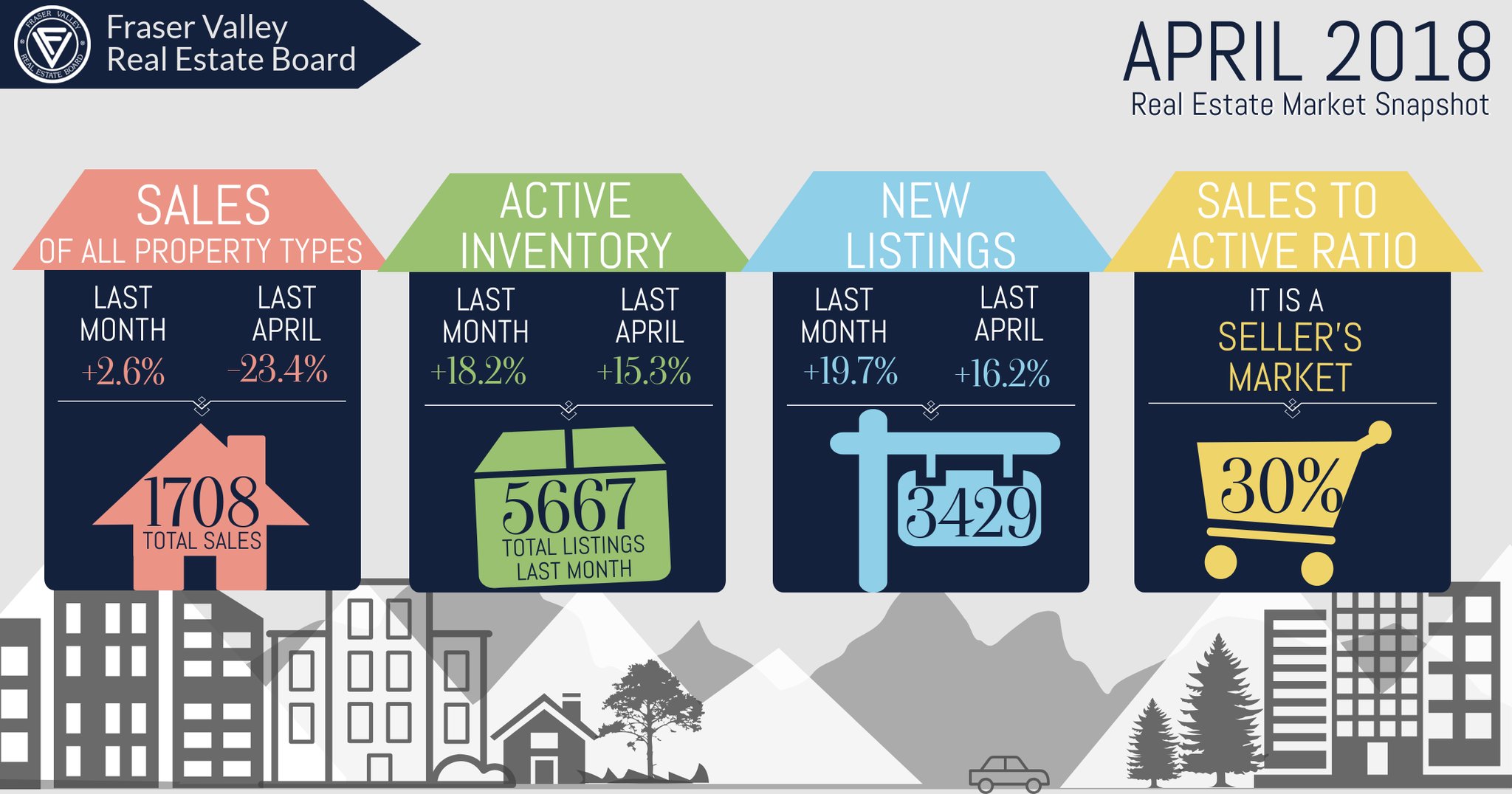 菲沙地产局(Fraser Valley Real Estate Board)2日公布最新统计,2018年4月销售量为1,708套。比2017年4月少23.4%,比2018年3月上升了2.6%。