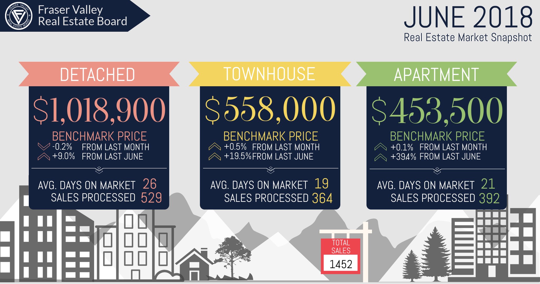 菲沙地产局(Fraser Valley Real Estate Board)4日公布最新统计,2018年6月,菲沙河谷地区共有1,452套售出,比2017年6月的2,571间销售量下降43.5%,与2018年5月的1,758间销售相比下降了17.4%。