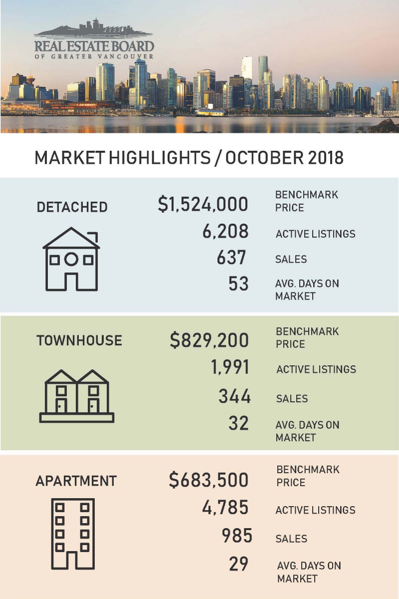 2018年10月独立物业的销售量达到637,比去年同期减少了32.2%。基准价$1,524,000,较去年同期减少了5.1%,比过去三个月减少3.9%。