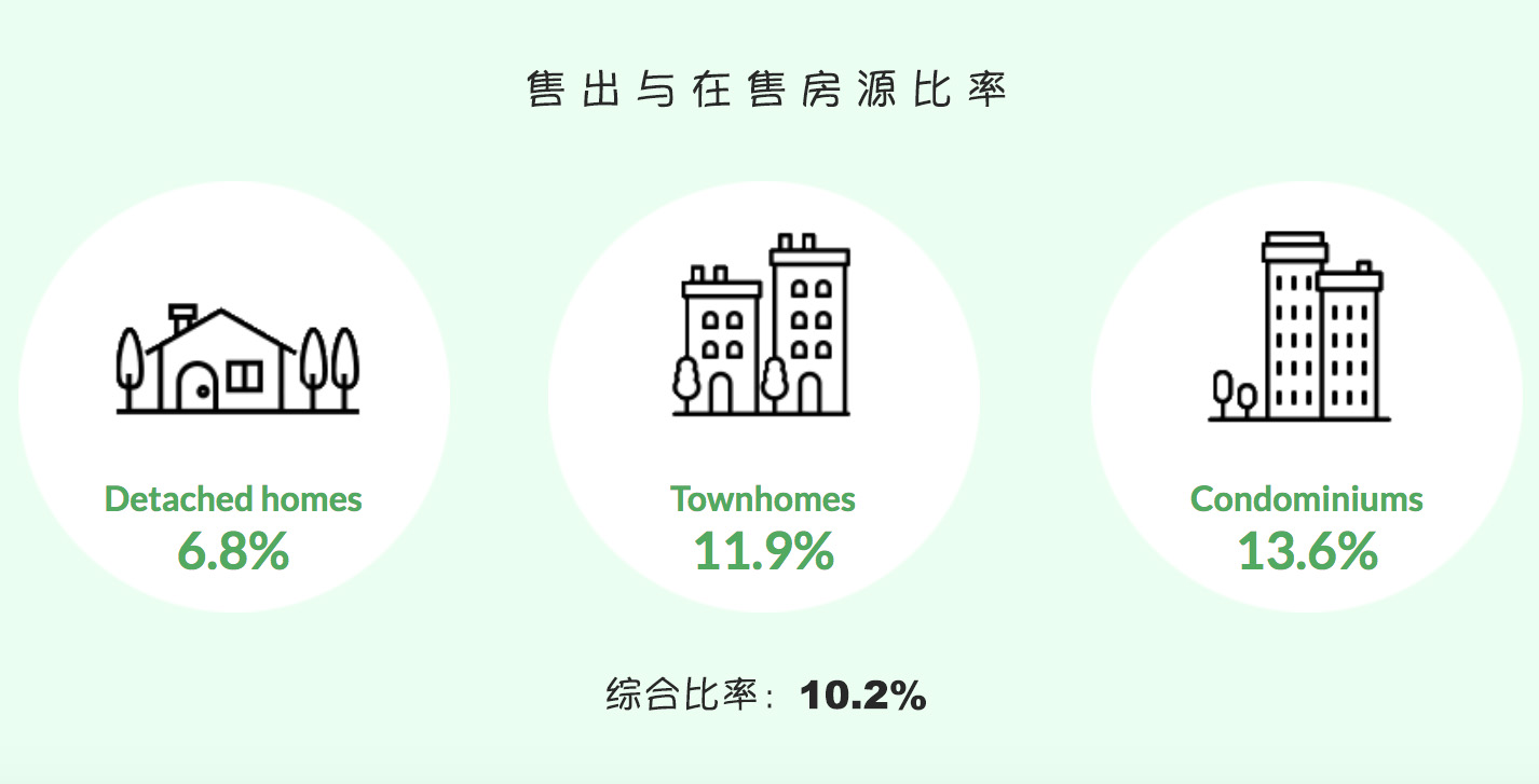 对于所有房产类型,2019年1月的销售与活跃房源比率为10.2%。按房产类型划分,独立式住宅的比例为6.8%,联排别墅的比例为11.9%,公寓的比例为13.6%。