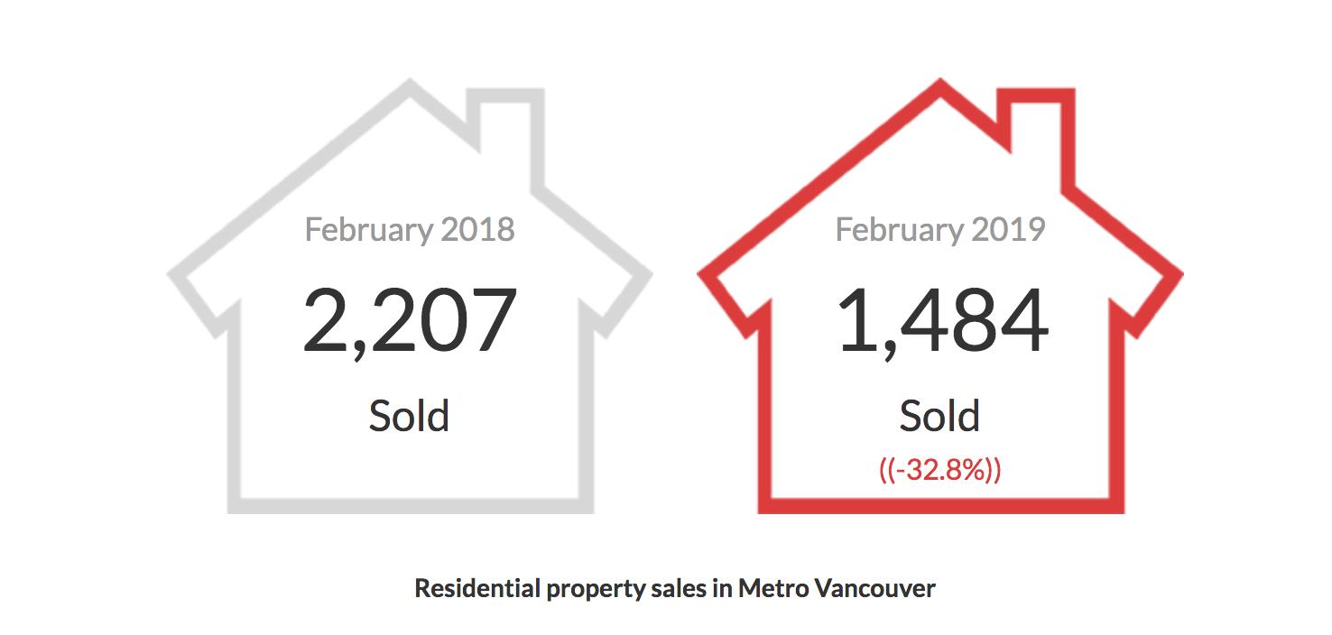 大温房地产局(Real Estate Board of Greater Vancouver)4日公布2019年2月的房屋销售数据。2月份大温哥华地区住宅市场的房屋供应量增加,购房者的需求低于平均水平。2019年2月该地区的住宅销售总量为1,484,比2018年2月的2,207个减少了32.8%,比2019年1月出售的1,103个增加了34.5%。