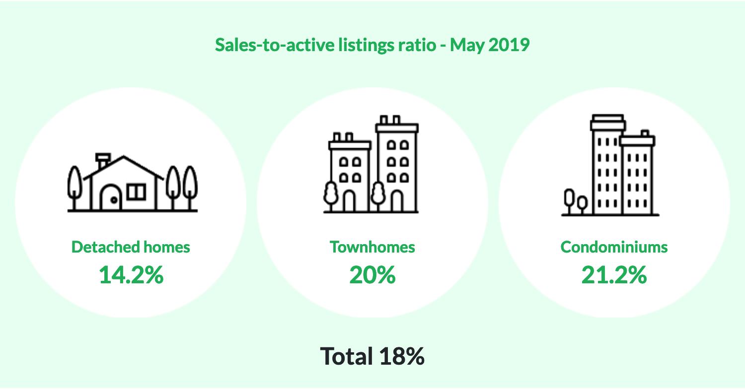 对于所有房产类型,2019年5月的销售与活跃房源比率为18%。按房产类型划分,独立式住宅的比例为14.2%,联排别墅为20%,公寓为21.2%。