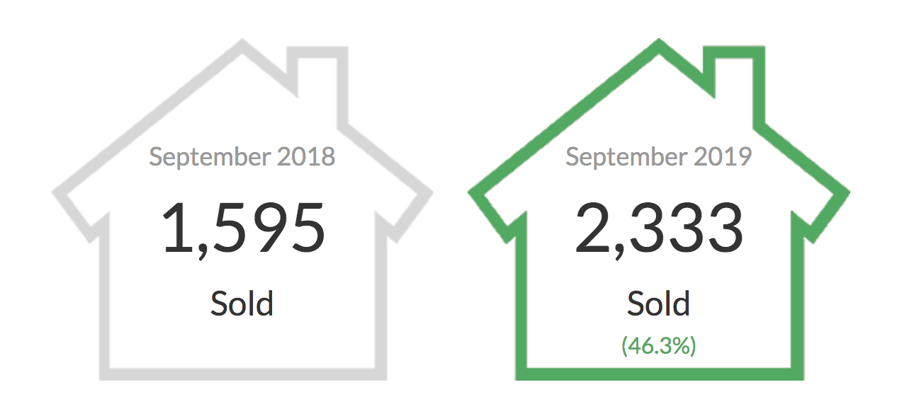 目前在大温的MLS®系统上挂牌出售的房屋总数为13,439套,比2018年9月(13,084)增加2.7%,比2019年8月(13,396)增加0.3%。