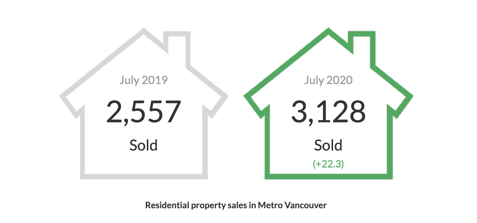 大温哥华房地产局(REBGV)报告称,2020年7月该地区的住宅销售总额为3,128套,比2019年7月记录的2,557套销售增长了22.3%,比2020年6月售出的2,443套房屋增长了28%。